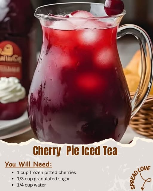 Ingredients: 1 cup frozen pitted cherries Desserts ⅓ cup granulated sugar ¼ cup water Pinch of salt 1 teaspoon lemon juice 1 teaspoon vanilla extract 1 teaspoon butter extract ½ teaspoon cake batter extract (optional) 2 cups Gold Peak Unsweetened Black Tea 4 tablespoons cherry pie syrup Fresh cherries for garnish Instructions: see continuation on next page