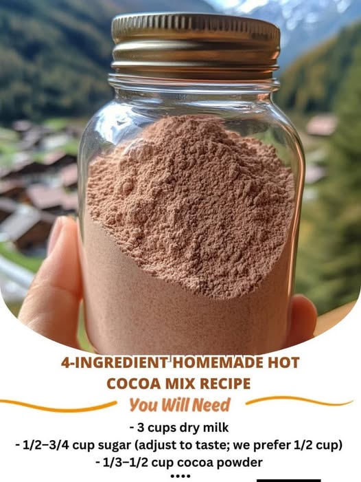 Ingredients: – 3 cups dry milk– 1/2–3/4 cup sugar– 1/3–1/2 cup cocoa powder– 1/8 teaspoon salt Hot Chocolate Directions: see continuation on next page Candy & Sweets